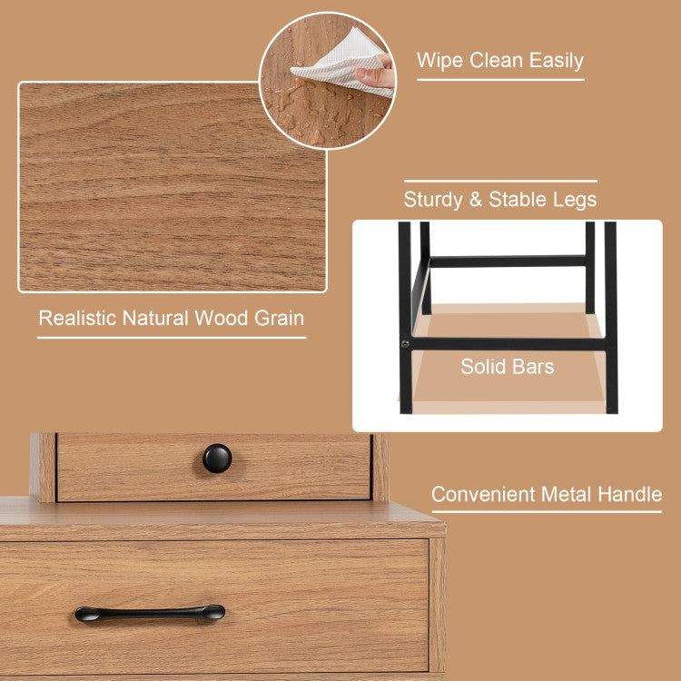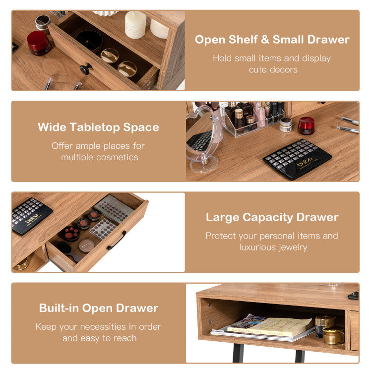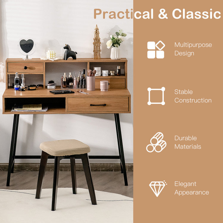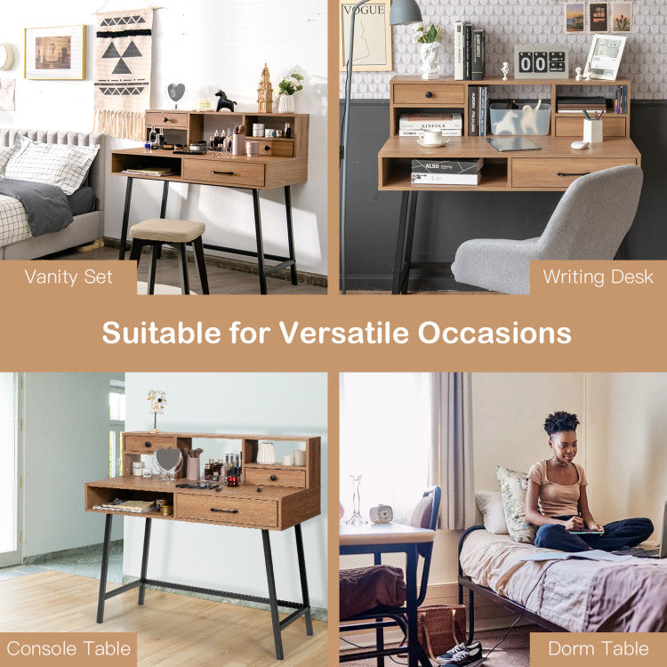 This vanity desk features a tabletop shelf and two drawers, providing you with ample storage options to place make-ups, decors and other personal items. You can not only use it for dressing up, but also perform your studying or working on it. Its steel legs ensure the overall stability and the weight capacity of the tabletop is up to 110 lbs. Its industrial and classic design will perfectly blend in your home decor style. Moreover, it doesn`t take up much room and is really suitable for small apartments or dorms.