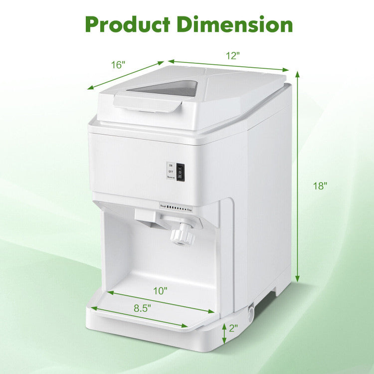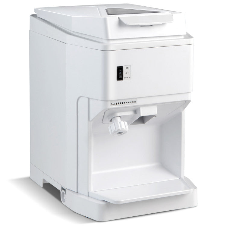 The ice hopper can hold up tp 5.1 lbs ice cubes. It's ideal for both family and commercial uses. Besides, it's also easy to operate. You can easily start this ice shaver with button. By rotating the adjustment knob, you are able to control ice fineness from rough to fine. The rough ice needs 3-5 minutes, while the fine ice needs 5-8 minutes. When crushing ice, the top lid can prevent outside dust. Also, the lid with convenient handle also simplifies cleaning process. Apart from that, it also features visible window, removable tray and drainage hole. Solid ABS and aluminum material as well as non-slip foot pads keep it durable and stable, so it can serve you for years.