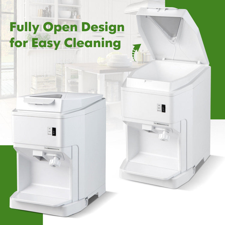 This 460W ice crusher with sharp blades ensures an ice shaving speed of 320 rpm and produces 265 lbs shaved ice per hour.