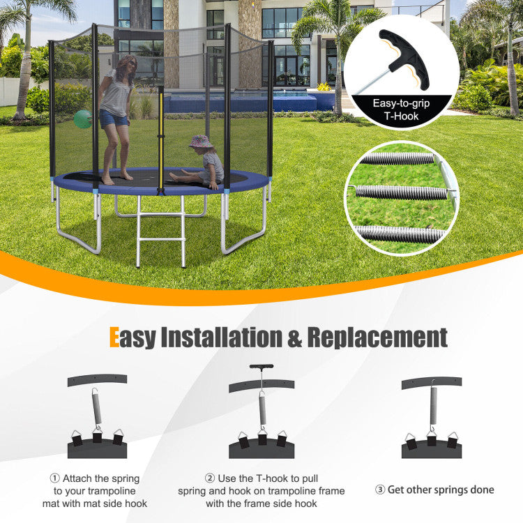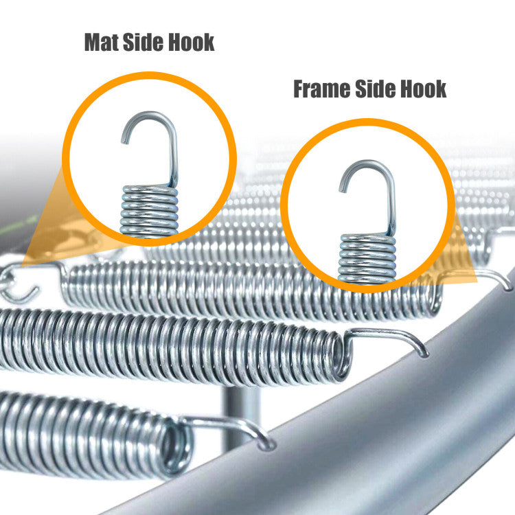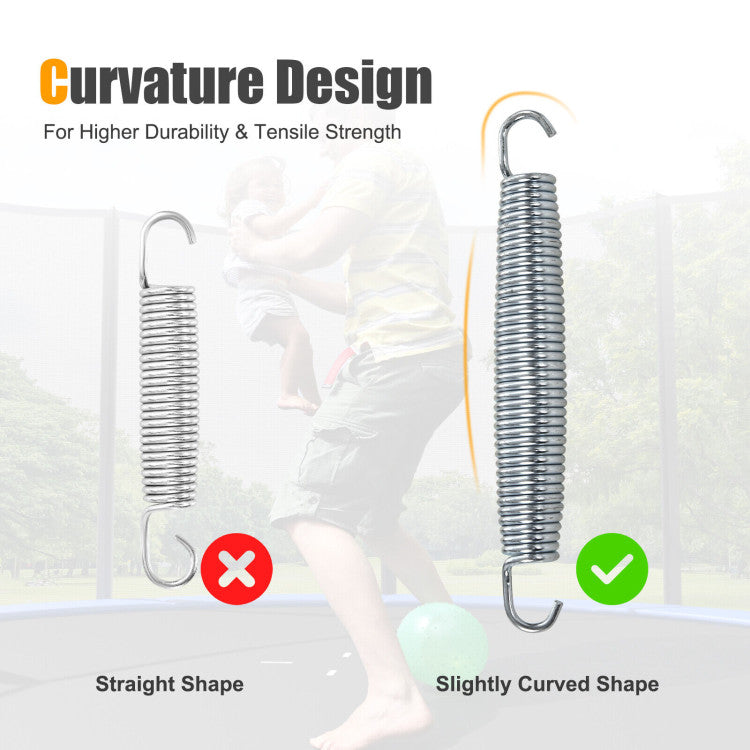 Made of heavy-duty and rustproof galvanized steel, the trampoline springs provide you with a safe jumping experience and could withstand the everyday beating that trampoline springs receive. Besides, more coils provide better bounce, allowing you and your little ones to jump higher. Due to the curved angle design and T-hook spring pull tool, replacement is quite easy for you.