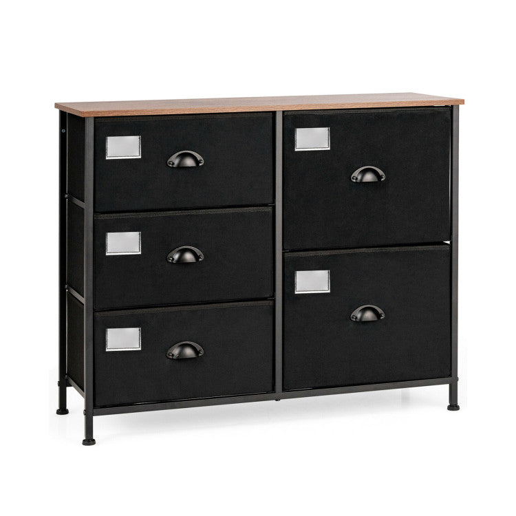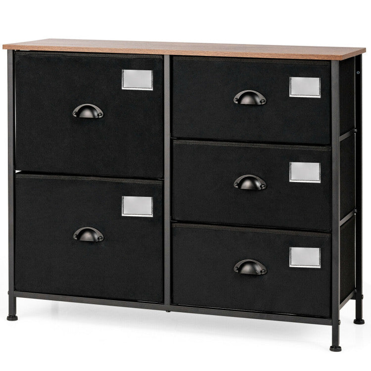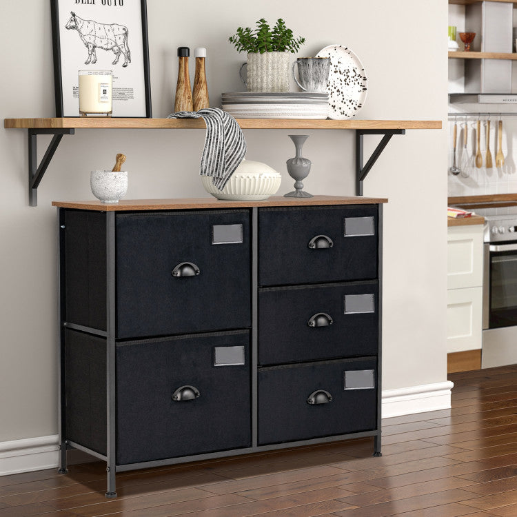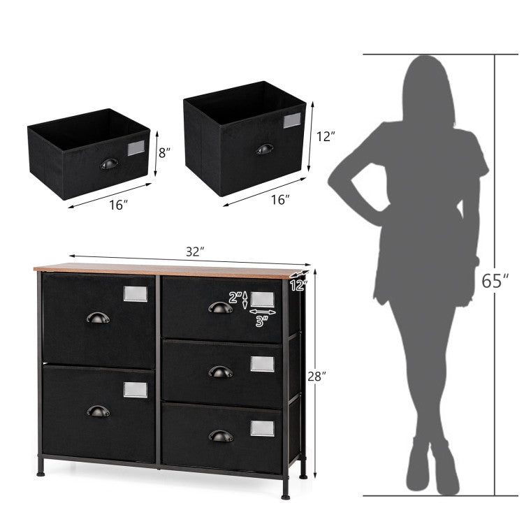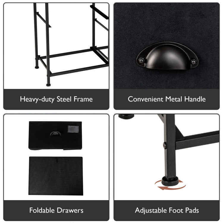 Solid steel frame and durable fabric offer sturdy and durable structure for long-lasting use. 5 folding fabric drawers satisfy your daily needs for storing clothes, toys, books, etc. The adjustable feet and additional tilting-preventing device ensure safety and stability. The compact design is perfect for small spaces and works equally well near the bed or sofa.