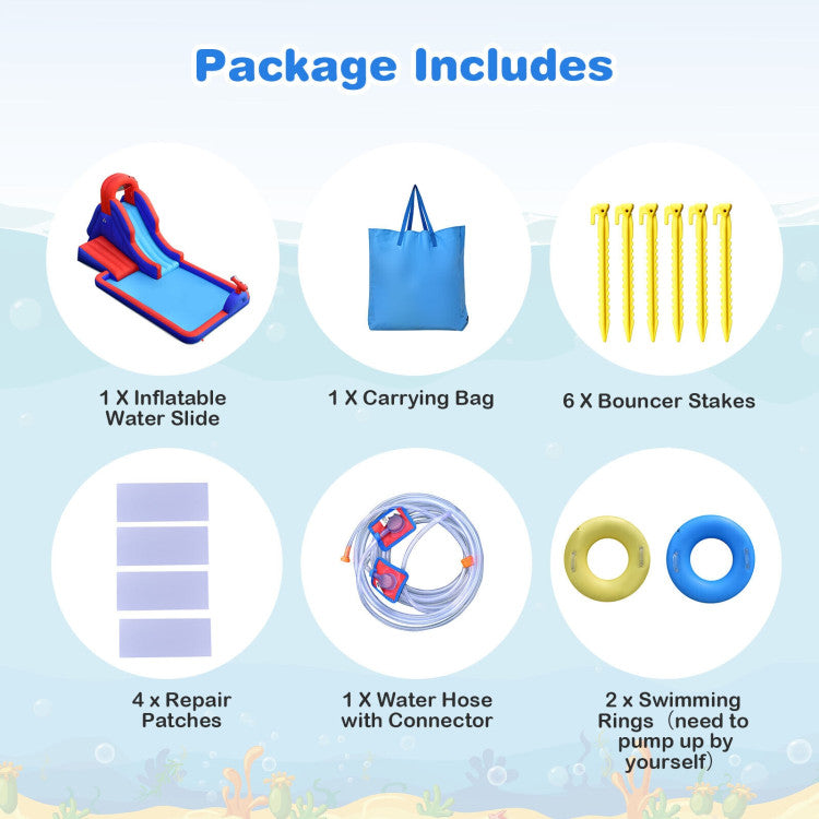 This inflatable water park combines multiple functions and entertainment perfectly. with a long slide, a climbing wall, an oversized splash pool, a water gun and a flowboarding area, your kids can enjoy endless fun with their friends in this water slide bouncer park. made from non-toxic and durable 840D+420D oxford cloth material, this inflatable water slide is secure, stable and wear-resistant for long-lasting use. it can hold up to 350 lbs and is suitable for 3 children to play together (note: Each child should be less than 116 lbs). besides, this inflatable slide bouncer can be firmly fixed to the ground with the included 6 stakes, allowing kids to play freely and safely. by connecting to a 480wblower (not included), you can quickly inflate the bounce house slide in a few minutes. and a carrying bag is provided for you to take the inflatable water slide outdoors conveniently.