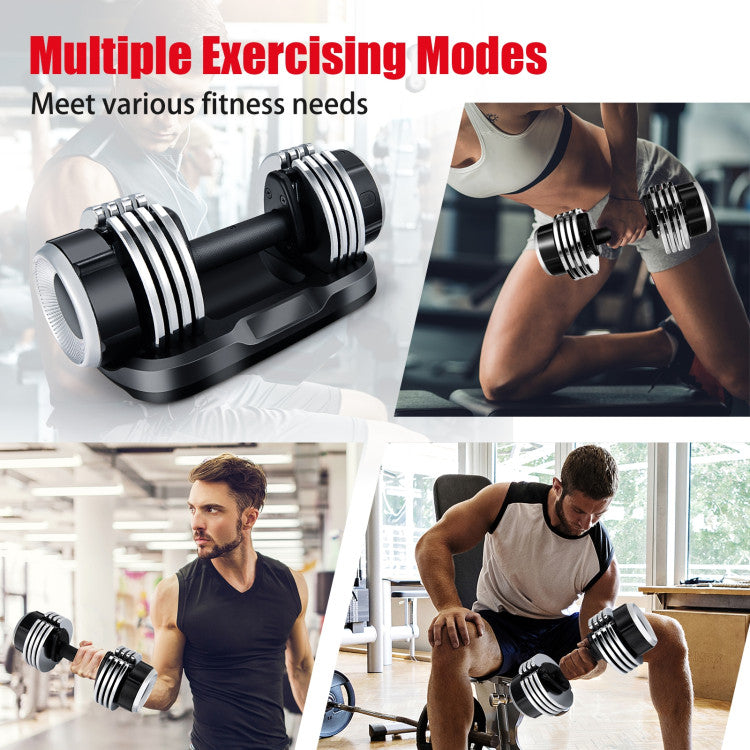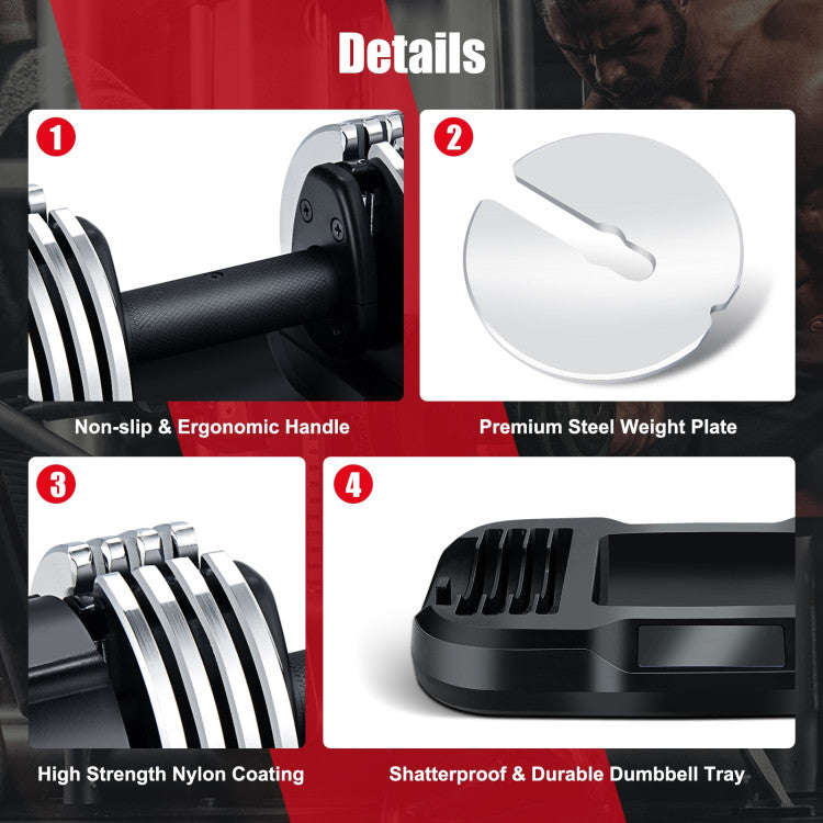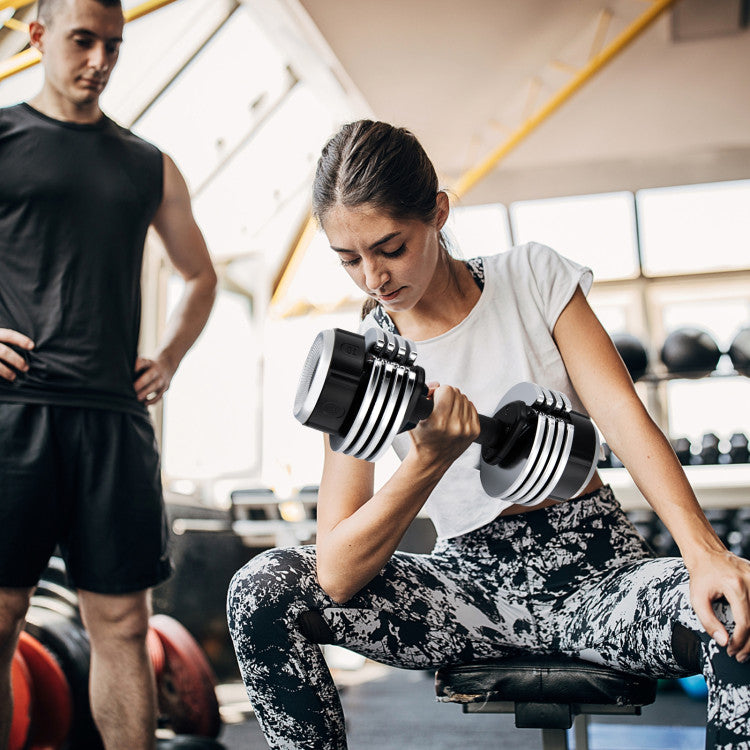 One set equals five. This dumbbell allows one-hand operation and one second adjustment by rotating to your desired position conveniently----Clockwise to decrease weights while counterclockwise to increase weights. It provides you with multiple exercise and training methods. You can build muscle strength, increase bone density, release metal stress and enhance cardiopulmonary function. Just enjoy full-body workout and strength training with this practical adjustable dumbbell set!