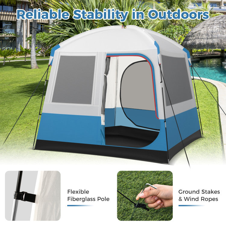-Ground stakes and wind ropes help stabilize the tent