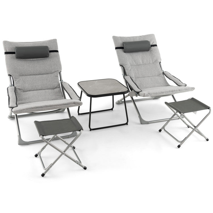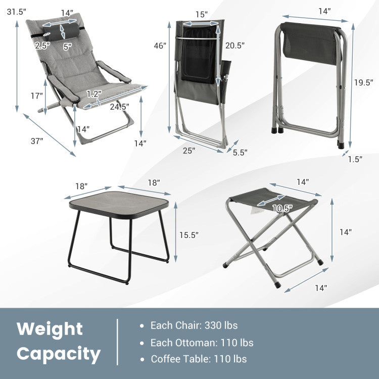 -Includes 2 folding chairs, 2 folding footrests and 1 coffee table