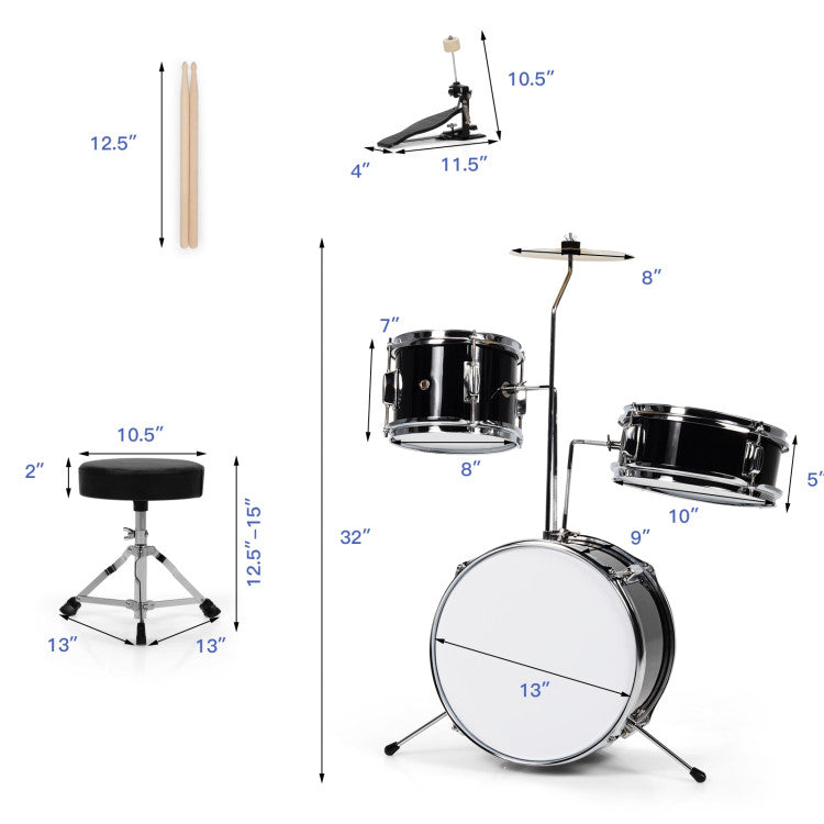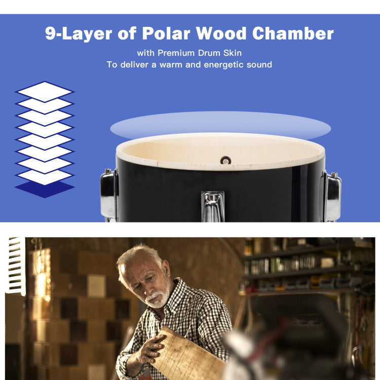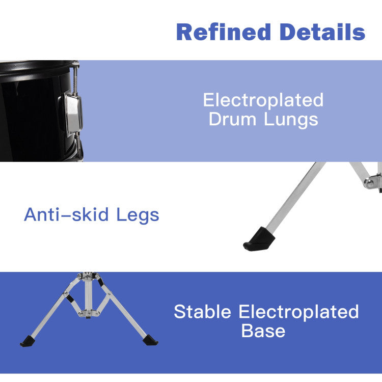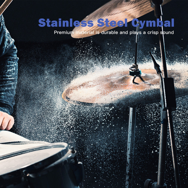 The drums have 9-layer hardwood shells with premium drum skin to play a beautiful drumbeat. And the cymbal, which is forged by stainless steel, shows a crisp and clear sound. Including a tome drum, a snare drum, a bass drum and a cymbal, this drum set has everything you need to encourage your little drummer. It is suitable for starters who just show interest in music or the promising young drummers as well. The strong electroplated drum lungs and stands hold the instruments sturdily. And this set comes with 2 hardwood drumsticks, a bass pedal and a height-adjustable seat. Besides, this drum set has a high gloss finish, which will look fantastic on a stage or in your hom.