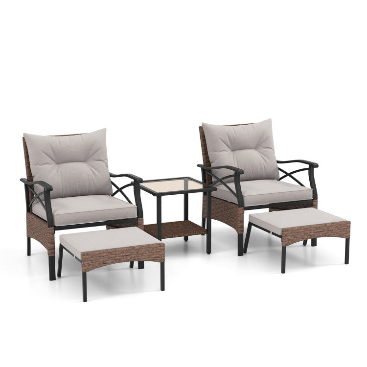 -Space-saving patio set: tuck 2 ottomans under the chairs when not in use