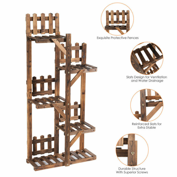 It is not only made of solid wood but also forms triangular brackets on each floor, making the bookshelf more environmentally friendly and strong. We provide storage space of different lengths, widths, and heights, so you can safely put different sizes of flowerpots. Behind each layer is a combined horizontal bar device that looks like a boundary, this gives your flower pots a safe platform in case it falls from behind. What's more, the hollow design gives your plants better breathability. The excess water goes to the next layer of plants when you're watering, it saves the water. You can also use it as a storage rack and place lots of items, such as plants, books, collectibles, and photographs.