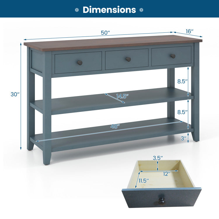 -Long tabletop and 2 open shelves for decorations and storage baskets