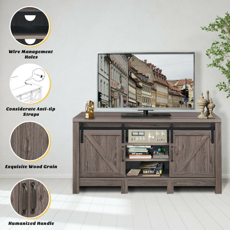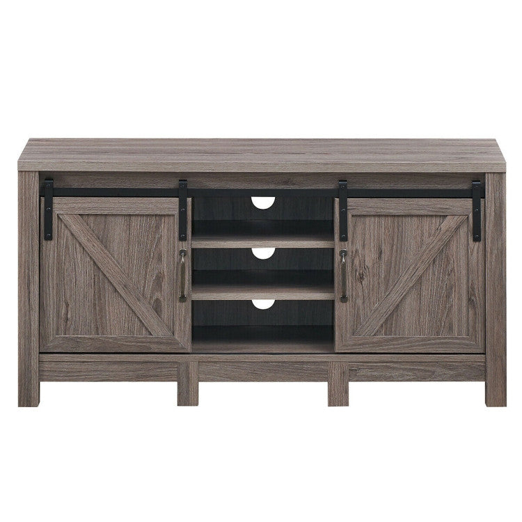 Crafted of high-quality engineered wood and 6 sturdy legs, this TV cabinet is stable and durable for long-term use. The spacious desktop will fit up to 55" TVs and some decorations. With adjustable design, 3-tier storage shelves and 2 large cabinets can not only offer plenty of space but also meet the needs of items of different height. What's more, 2 sliding barn doors allow you to adjust the door position freely and add an aesthetic feeling of this TV stand. The multifunctional stand with classic appearance can be used as a TV stand, console table, or sideboard in your living room, bedroom, entryway, office, and more.