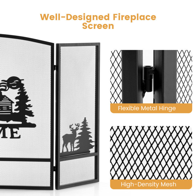 Forest Moose Decorative Screen: This fireplace fence features appealing and vivid patterns: a mountain hut on the middle panel and forest deer on the 2 side panels. The attractive look will make the fireplace screen a perfect home decoration. Thoughtful Protection: Measuring 55" x 29.5", the fireplace screen with high-density metal mesh can effectively block all sparks and ashes from the burning fireplace, which will offer protection to kids, pets and furniture. Heavy-Duty Metal Frame: The whole fireplace guard is made of premium metal, which is rustproof, anti-deformation and heat resistant. And thus, the metal frame ensures high stability and durability. Quick Folding Design: With a flexible metal hinge between each panel, the fireplace fence can be quickly folded or expanded, which is designed for convenient storage and carrying. No Assembly Need: The well-designed fireplace screen requires no assembly when arriving. You just need to take it out and expand it for direct use. Overall dimension: 55" x 29.5" (L x H).