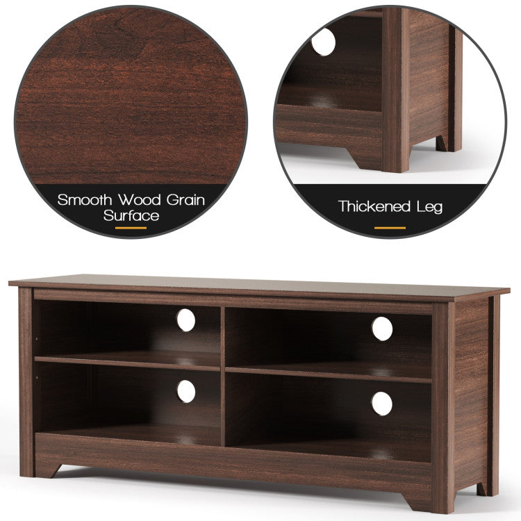 The top can support TV up to 60 inches, and the adjustable shelves help you store necessary media or gaming devices. The TV stand is more than a TV stand, it is a piece of furniture for your home. With a clean edged top, rectangular legs, the distinctive TV stand creates a warm and charming atmosphere for your home or office. This TV stand is designed to blend into a variety of living and family room settings.