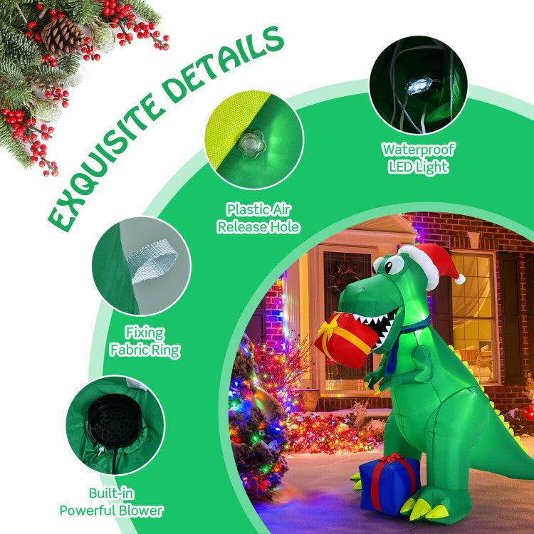 It is 6Ft tall and looks just as tall as an ordinary adult. The inflatable dinosaur with a bright smile has big eyes and carries two inflatable gifts. We believe that its lovely appearance will be very popular among children. As for its high quality, the Christmas inflatable dinosaur is made of waterproof polyester fabric which greatly enhances overall scratch resistance. And it also has good non-fading properties. Inside, there are waterproof LED lights making the dinosaur stand out at night. What’s more , the whole installation is relatively effortless. The built-in blower will automatically blow up the dinosaur quickly, you just need to wait for a while. With grounding ropes and grounding stakes, the fixation also becomes easier. You can stop worrying about it easy to tip over.