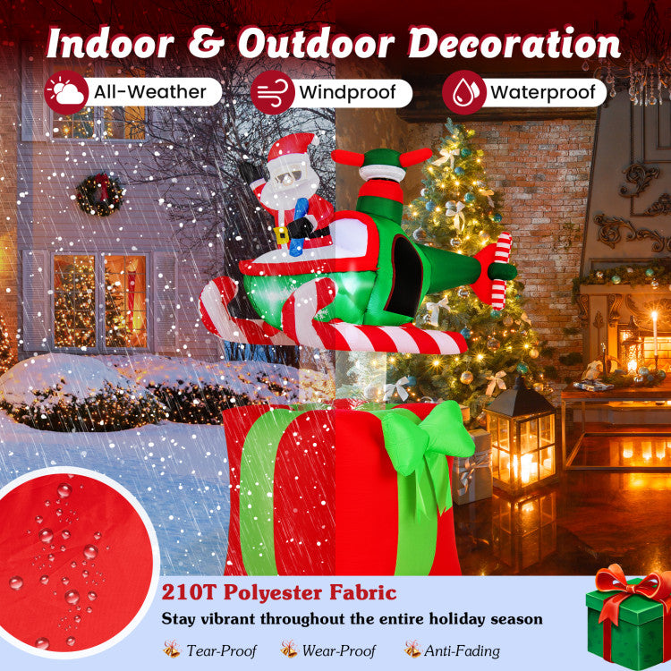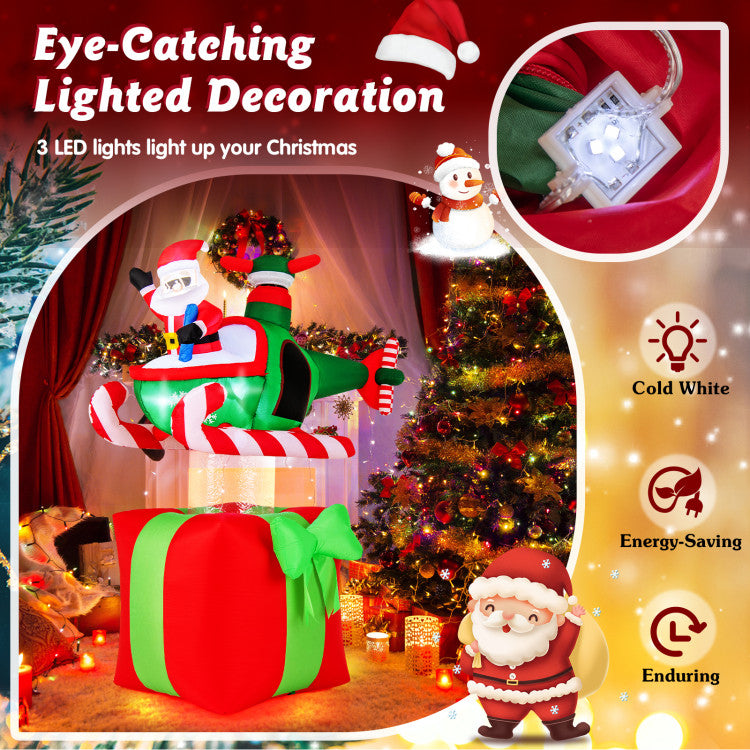 -Santa Claus pilots a helicopter and lands on a large, red gift
