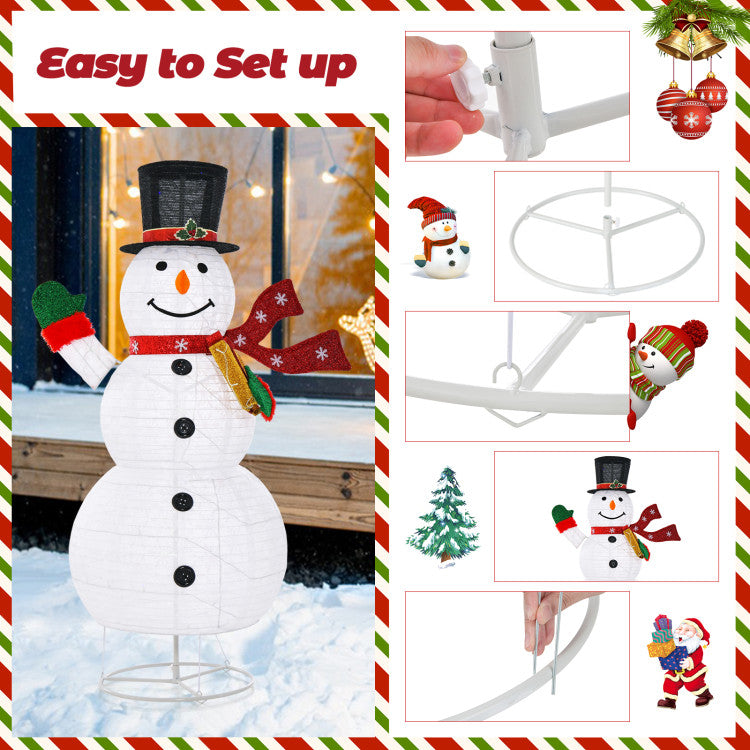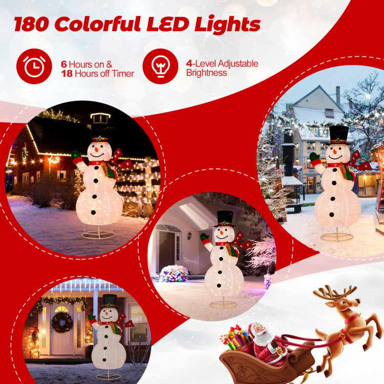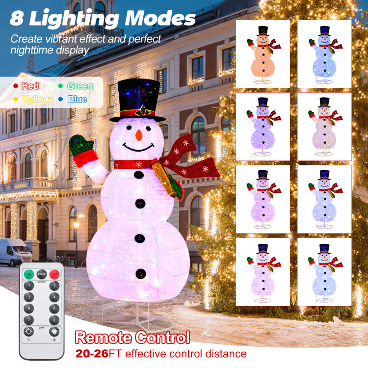 Amazing Lighting Effect: The Christmas snowman features 180 colorful LED lights to create a vibrant effect and perfect nighttime display. More, 8 lighting modes and 4-level adjustable brightness make the decoration novel and attractive both day and night. Adorable Christmas Decoration: Our 6ft holiday decor perfectly matches the Christmas theme. The lifelike snowman wearing a red holly decorated hat and scarf raises hands with a warm smile, holding a gift box to give a jolly festive welcome to your family and friends. Easy to Set up and Operate: The lighted Christmas decor can be easily assembled in minutes without any tools. Plus, 6 hours on and 18 hours off timer function helps you control the snowman automatically. The remote control with 20-26ft effective control distance allows for easy operation. Built with Strength: Delicately made of durable polyester fabric, the snowman is wind-resistant, snow-resistant and rain-resistant, which can endure the test of time. Sturdy metal stand presents a reliable structure and longer service life. Keep it Secure to the Ground: There are 8 ground stakes to help you keep the decoration in place. What's more, 33ft rope is included to improve windproof performance. Each part is fastened with cable ties to ensure stability.