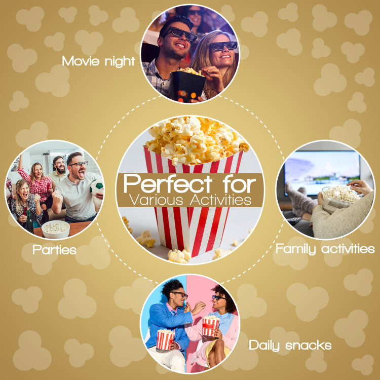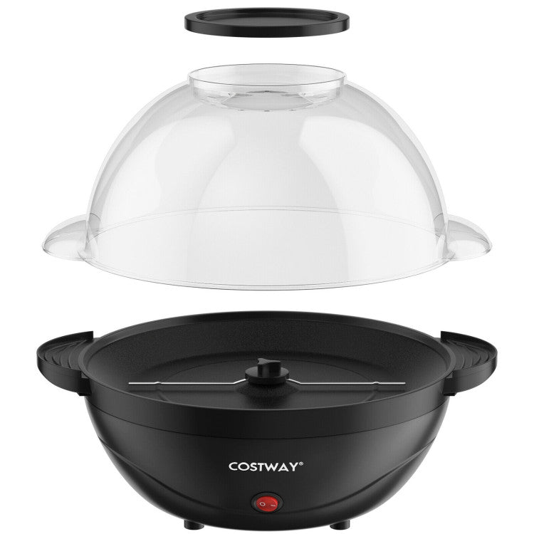 It is simple to cook with just adding material and a press on the power button. This popcorn maker has a 24-cup capacity, which is enough to entertain the whole family. And you can cook your own preferred flavors. The electric stirring rod and the non-sticking cooking plate make the cooking and the cleaning more efficient and convenient. Besides, you can wash the bowl and the cap in the dishwasher. The lid also doubles as a serving bowl, which has vented holes to escape the steam and melt the butter into the plate. This popcorn maker is compact in storage with its base resting on its lid.