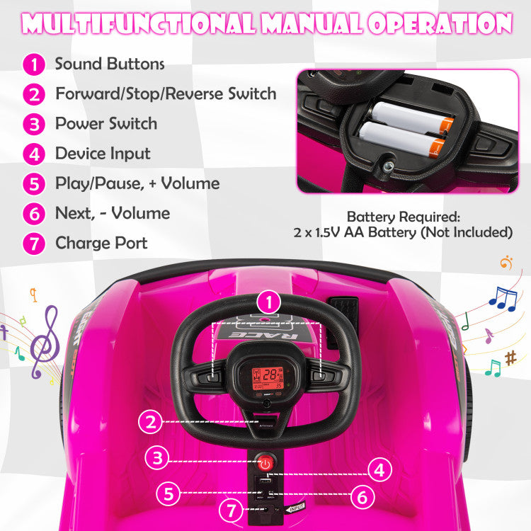 2 Different Operation Methods: The ride-on go-cart is designed with a convenient steering wheel and foot pedal to meet kids' need for manual operation. Apart from that, this electric vehicle also features a 2.4G parent remote control for parents to move it forward/ backward or turn it left/ right. The remote control requires 2 AAA batteries, not included. Fun Steering Wheel and Control Panel: To bring kids more fun, we specially design it with a multifunctional control panel and steering wheel(requires 2 AA batteries, not included) for kids to enjoy music or sound effects. It also has a USB port to connect external devices for more music. And kids can freely play, pause, increase or decrease the volume of the music. Slow Start and Adjustable Safety Belt: The remote control is designed with a slow start function to better ensure kids' driving safety. Adjustable safety belt and soft bumper make it safer to use. In addition, spacious seats and safe backrests prevent kids from leaning back. The seat holds up to 66 lbs. Offers Realistic Driving Experience: With a built-in 6V battery and strong motor, the kid's go-cart guarantees a safe speed of 2 mph to offer kids an unforgettable riding experience. 4 durable and wear-resistant wheels make the car suitable for different road conditions, such as the wood floor, cement road, brick road and more. Perfect Gift for Your Toddlers: Cool appearance and child-friendly materials make it suitable for 37-96 months old kids. This vehicle requires 8-12 hours of charging time and is able to provide kids with long playing time. With this go-cart, kids can promote their strength, endurance, and coordination.