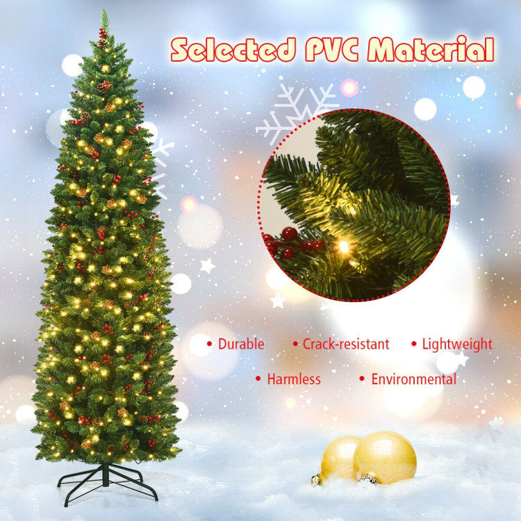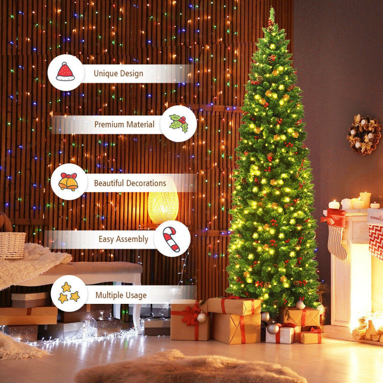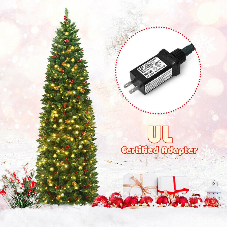 Don't worry about having no space for a Christmas tree. Its slim shape is great for displaying in small room and tight corners with limited space. Lush PVC branch tips with cones and red berries will help to simulate an extremely real Christmas tree. Comes with 350 LED lights and UL certified plug adapter, this tree provides sustainable lighting for the whole holiday. What's more, hinged design makes assembly easy and quick. It is an attractive addition in party, Halloween, Christmas, etc.