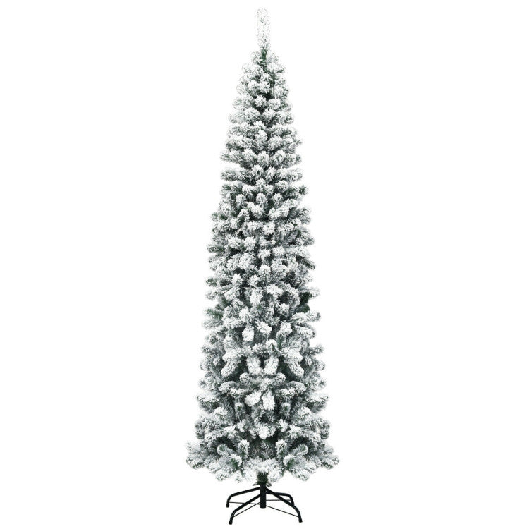 Snow Flocked Pencil Christmas Tree: Crafted with 641 branch tips, this 7.5ft snow flocked Christmas tree is leafy and elegant. It will add a unique wintry feel to any setting. With its slim pencil design, this artificial Xmas tree is space-saving and perfect for display in corners or rooms with limited space. Premium PVC Needles: The leaves of this slim Christmas tree are made of high-quality PVC material. Combining premium material and exquisite craftsmanship, these snow flocked leaves are not only lifelike but also of strong adhesion. Thus, they are not easy to fall off and fade, ensuring long term use. Sturdy Metal Stand: This pencil Xmas tree features an X-shaped iron stand that provides strong support. Compared with other cheap plastic bases, the metal stand is more stable and breakage-resistant, keeping it standing upright for years to come. Besides, the metal stand is foldable to facilitate storage. Easy to Fluff and Assemble: All hinged construction makes the artificial tree easy to fluff and set up, saving you a lot of time and effort. In addition, this Christmas tree can be divided into 2 sections and placed in a storage bag, allowing you to store it for future reuse conveniently. Eye-Catching Addition for Any Place: Snow flocked leaves create a unique wintry feel, making this 7.5 ft Christmas tree an eye-catching addition for any place. You can either put it at home to add Christmas atmosphere and celebrate Christmas with family members pleasantly or put it in shops to attract the attention of customers.