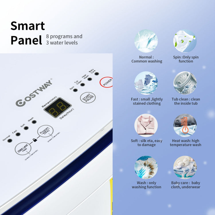 Designed with a heating function (30°, 40°, 60°, and 90°), this fully automatic washing machine can effectively remove stubborn stains and eliminate harmful substances. Therefore, it is perfect for washing your baby’s clothes. Additionally, the child lock and lid lock function ensures the safety of you and your kids at the same time. With 8 programs (normal, fast, soft, wash, spin, tub clean, heat wash, and baby care) and 3 water levels (Low: 14L, Medium: 21L, High: 28L), this premium washer allows you to choose the specific model as your different needs. This compact washing machine with 7.7 lbs large capacity not only fits for the limited space, such as apartment, dorm, and RV but washes multiple clothes at once. And the 24-hour delay function is convenient for you to set the washing time in advance according to your requirements. If vibration is beyond a certain level, the imbalance adjustment function will automatically adjust the imbalance.