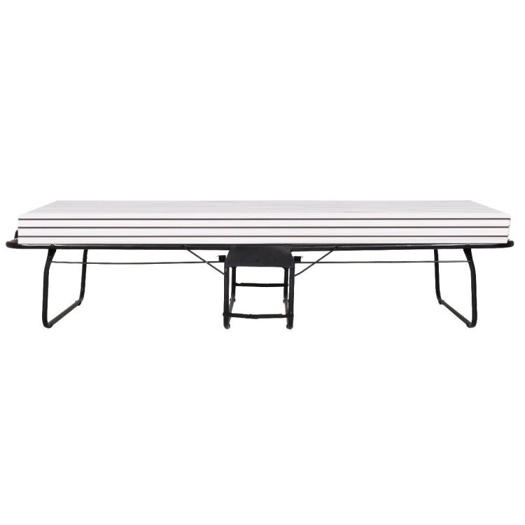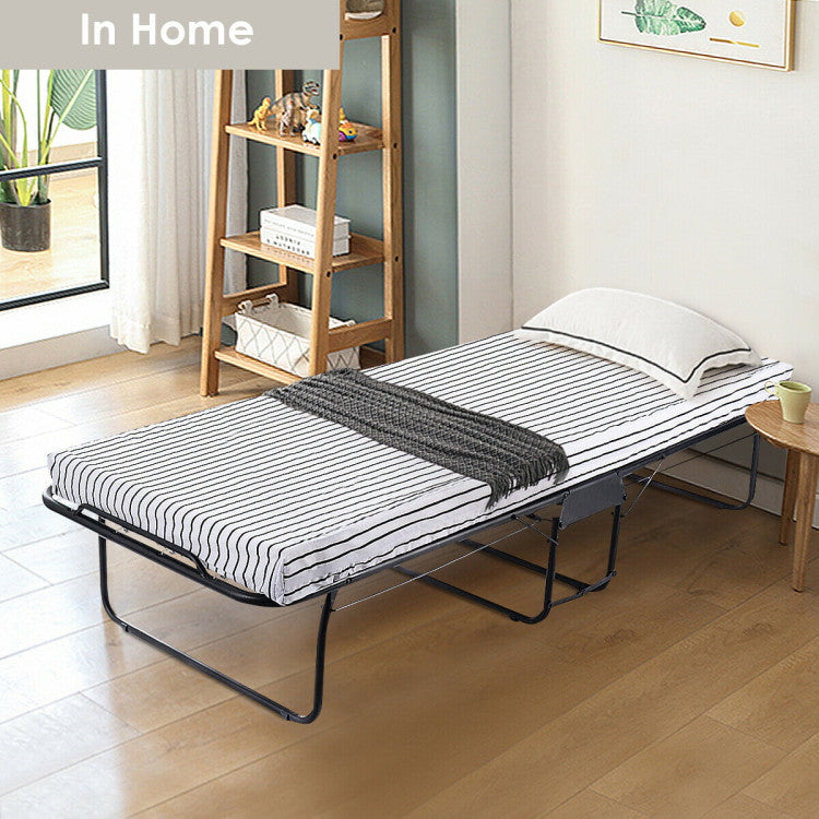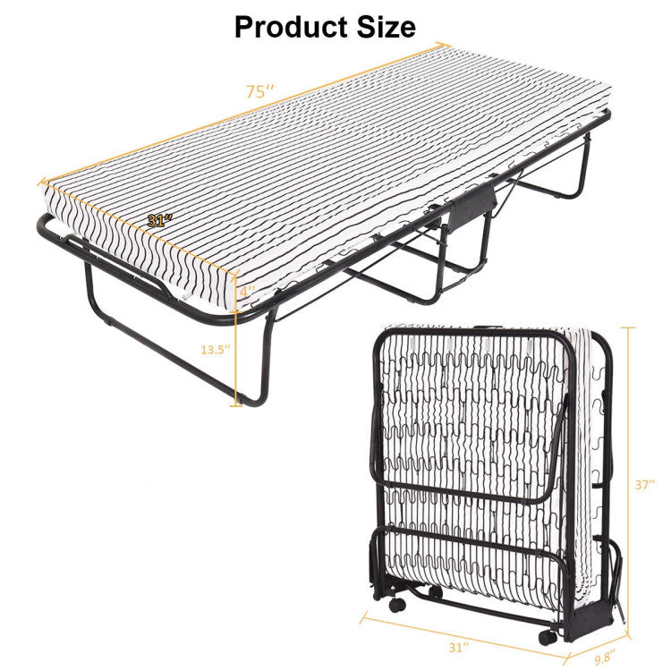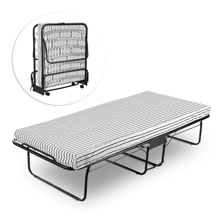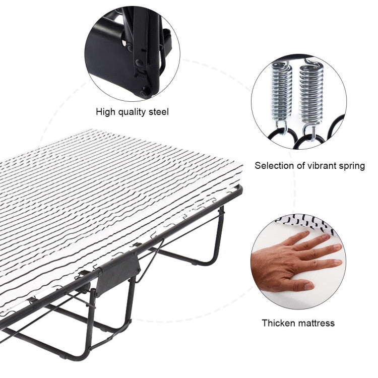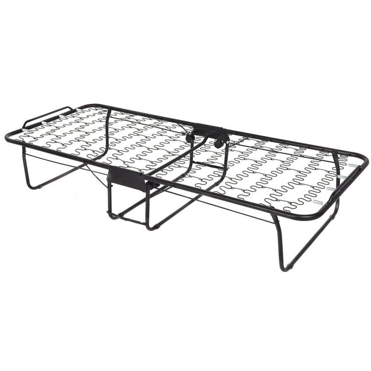 The bed comes with a 3.7" thickness mattress, so there is no need to buy an extra box spring. With a foldable design, you'll save a lot space when not using it. The metal bed is easy to open turning to a bed.