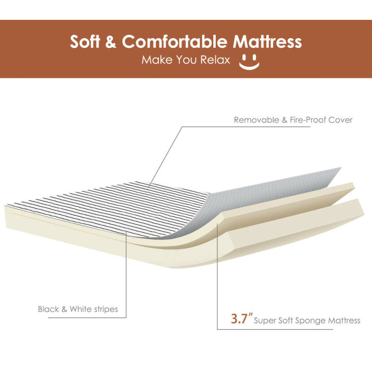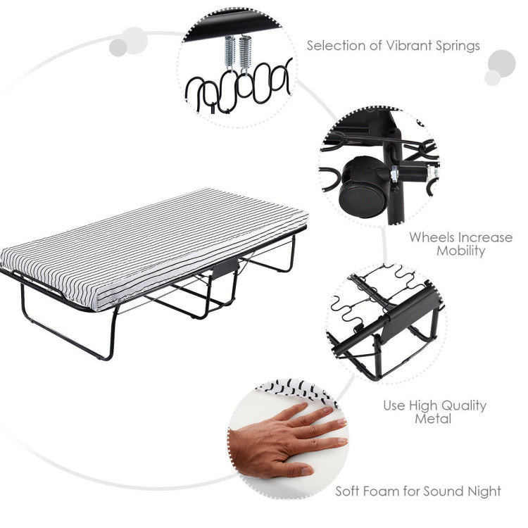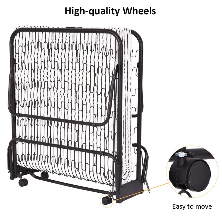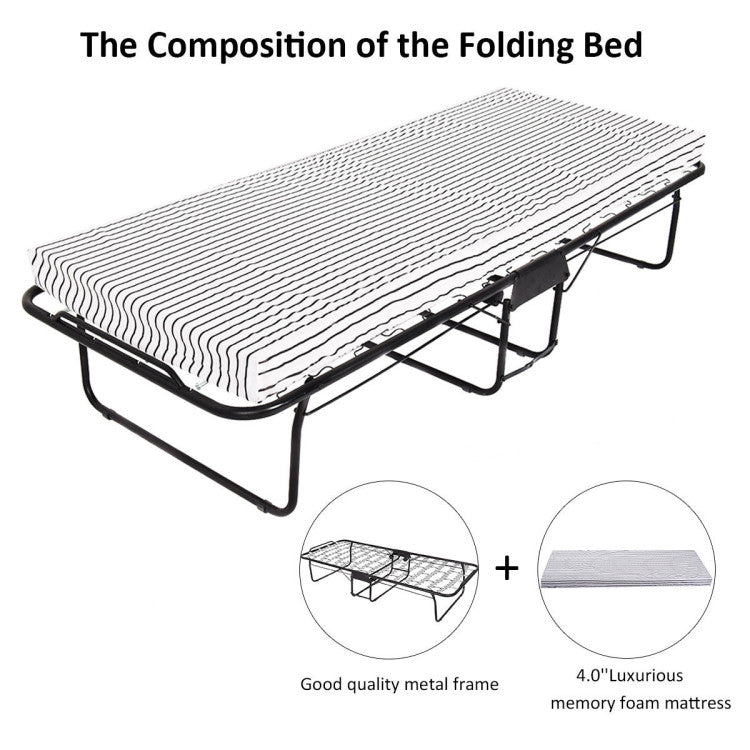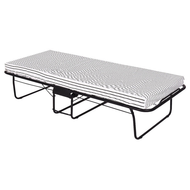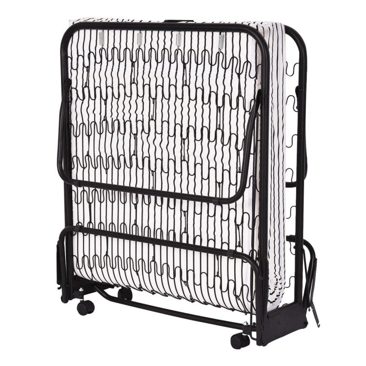 The bed comes with a 3.7" thickness mattress, so there is no need to buy an extra box spring. With a foldable design, you'll save a lot space when not using it. The metal bed is easy to open turning to a bed.