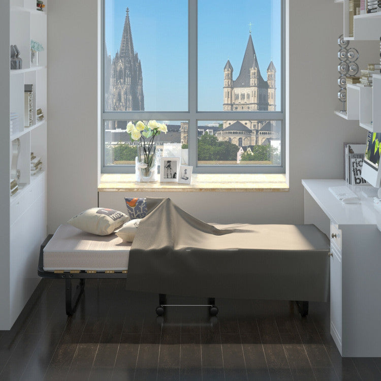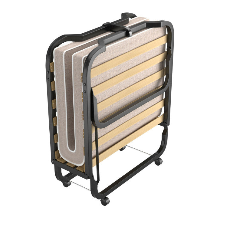 The mattress is filled with selected and highly elastic memory foam to provide you and your guests with a comfortable sleeping experience. It is supported by an upgraded metal frame with delicate to ensure maximum sturdiness and durability. It can hold up to 240 lbs without shaking. What's more, it only takes up a small room of 36'' x 44'' x 13'' when you fold it up. Equipped with 360°wheels and convenient handles, this compact folding bed allows you to create a space for overnight guests.