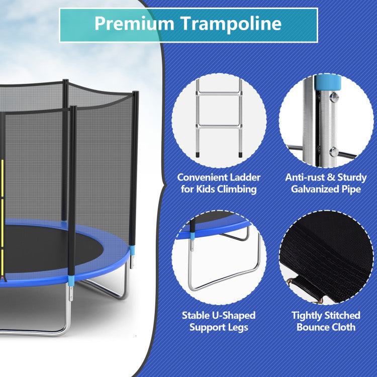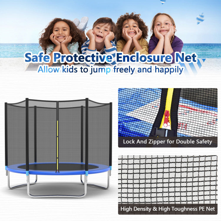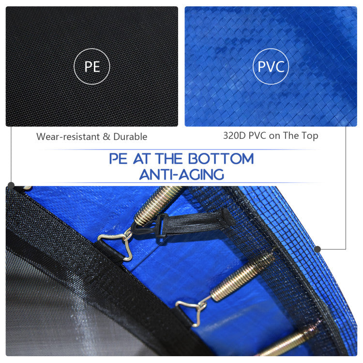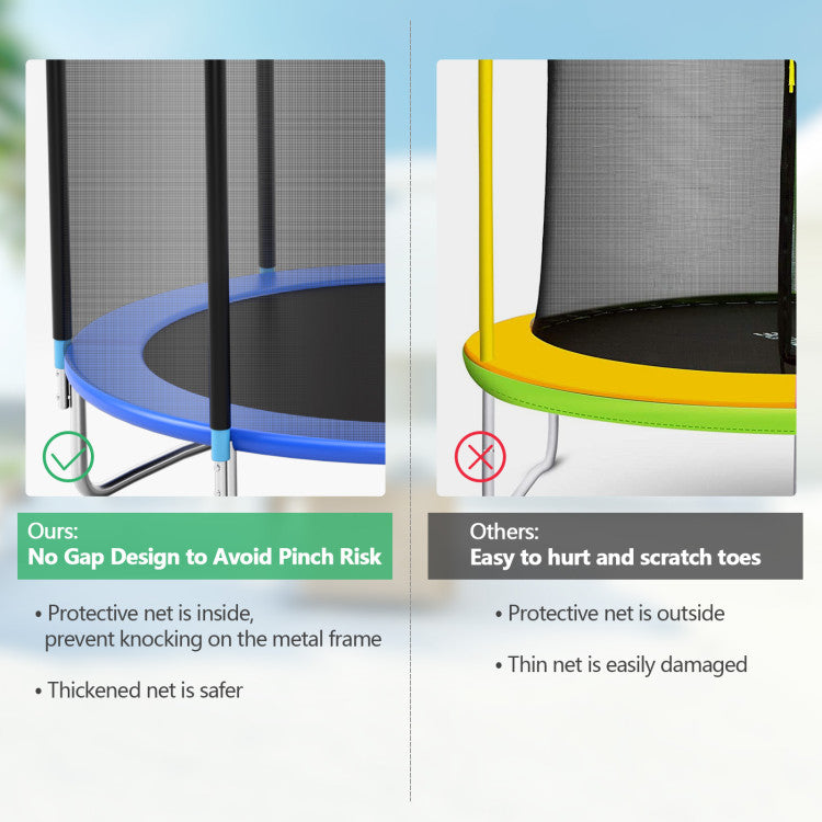 Quite simple, there is really a good choice for your family. This net enclosure combo is designed for trampolines with no existing enclosure net, fitting 8' trampoline with 3 U shaped legs. It comes with everything you need to setup the enclosure and more; including a sturdy net, foam sleeves for pole frames, and all the hardware. The enclosure combo is designed to attach at each spring, eliminating gaps between the mat and net, so you're guaranteed not to fall off. And the foam padded frame poles provide additional protection for you from being injured. The net has dual closure entry with zipper and buckles so that you will never worry about being injured.