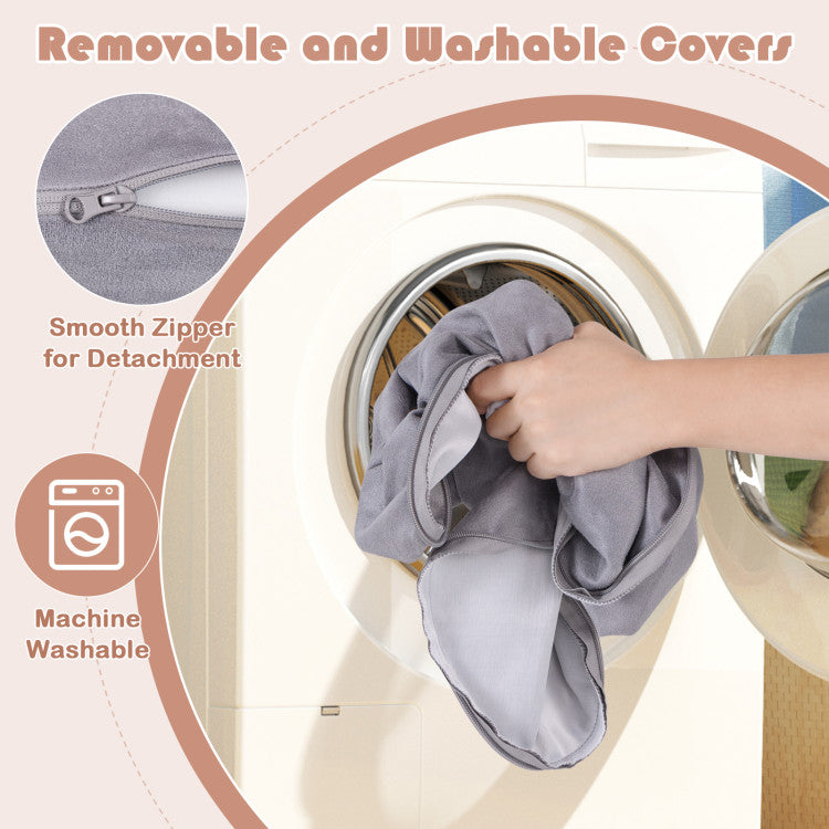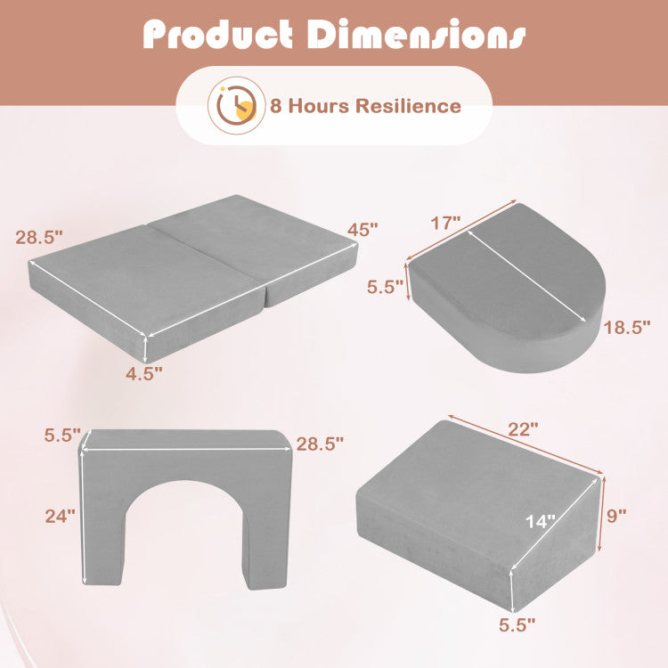 8-Piece Climbing Blocks Set: The modular kids play couch creates a cozy and fun playing environment for kids over 3 years old. Coming with 8 pieces (2 cushions, 2 arches, 2 trapezoids, 2 half moons) it can be reconfigured into a tunnel, play couch, longe, fort, or ball pit, which offers kids endless game possibilities. High-quality Suede Fabric: The skin-friendly and breathable suede fabric provides kids with a soft surface to crawl, jump, sit, or play. The suede fabric ensures outstanding wear resistance and wrinkle resistance for long-lasting play. Ultra Comfort & Support: The soft and supportive sponge ensures a comfortable sitting or playing experience. The high density sponge is also strong enough to withstand various activities of children. Moreover, the smooth edges and non-rigid structure make it safe to sit or play. Educational Gift for Kids: The 8-piece climbing block set will benefit kid's development. It not only reduces kid's screen time, but also promotes their curiosity, creativity, imagination, as well as cognitive ability. It is an ideal choice for kids to play with their friends and enjoy family time with parents. No Assembly & Easy Cleaning: No assembly is required. Please wait about 8 hours for it to fully expand. Thanks to the smooth zippers, you can easily and conveniently detach all covers for machine washing in cold water or tumble drying on low setting. The fabric covers are shrink-resistant and fade-resistant.