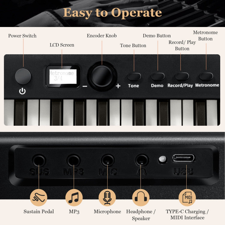 Besides, it can also upgrade your songs with sustain, vibrato, transposition, metronome and 2 chord. 88 full-size semi-weighted keys can not only give you a real touch of piano, but also deliver adjustable intensity response to your touch. In addition, wood grain design further enhances the playing comfort. Split function allows for duet playing and 2 teaching modes with lighted key function help you to learn to play with fun. To offer you more convenience, we also design it with one-button buckle design for folding and portable bag for carrying. Moreover, 1750 mAh built-in battery can last up to 12 hours playing time after a full charge, bringing much more convenience to your travel. Many external jacks and dual wireless connections function enable it to work with apps, MP3 and other devices.