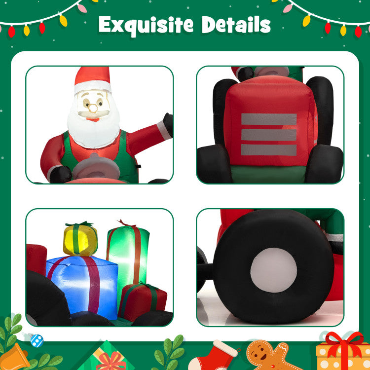 -Combines a Santa Claus, a tractor and stacked gifts to form a festive appearance