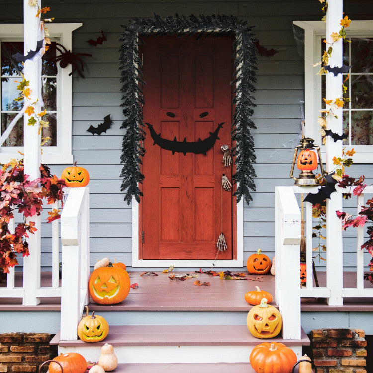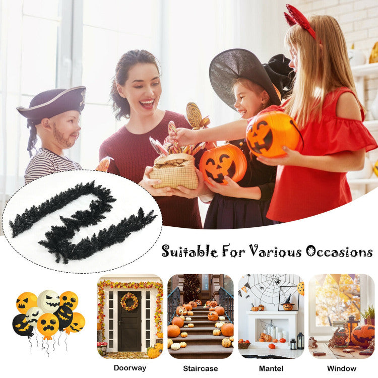 This pre-lit artificial garland features an all-black appearance and purple light strings. The striking colors can create a different atmosphere in your space during the holiday. This light strings are equipped with a waterproof timing controller and battery power allows you to place the garland anywhere you like.50 mysterious purple LED lights provide long-lasting brightness in 6 hours per day automatically. And after dark, you will get a lot of fun to enjoy the scene full of Halloween vibe. The flexible garland can be formed into different shapes that decorating various kinds of items, and can also add ribbons or more for a unique look. Please adjust the garland's branches after receiving the package to show a more perfect appearance.