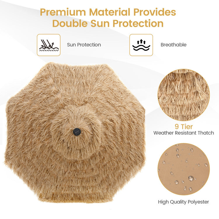 This 9 ft thatched umbrella has a push-button tilt mechanism that allows you to adjust the surface to 0-30° without having to move the umbrella. In addition, the umbrella is covered with nine layers of thatch to provide you with full protection from the sun! And the umbrella has double vents that speed up the exchange of hot and cold air, bringing you coolness. In addition, there is a crank on the pole, easy to open and close the umbrella. The umbrella canopy is made of high-quality PE and polyester cloth, which is fade resistant for high durability. Constructed of a heavy metal structure and 8 sturdy umbrella ribs, the umbrella has great stability. Unlike other umbrellas, this tiki umbrella can be used all day long. It is equipped with 32 LED lights and a center light, powered by a solar panel at the top. And there is a light switch on the umbrella rib for easy use. This Hawaii-style umbrella is easy to assemble and perfect for outdoor use. We recommend the umbrella be used with a dia-1.5" umbrella stand.