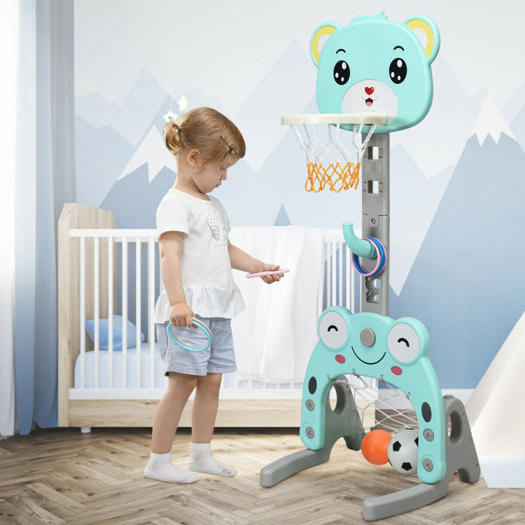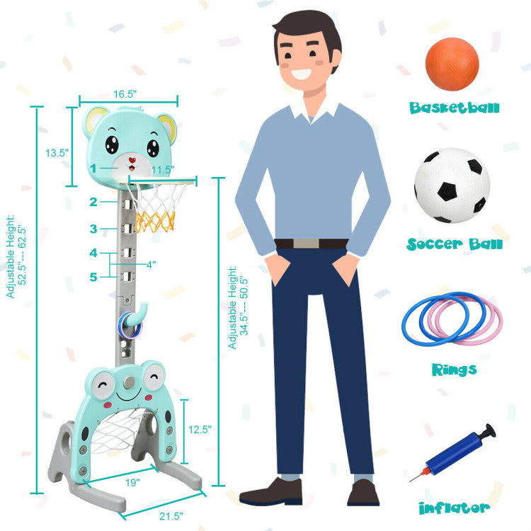 This 3-in-1 sports center allows children to enjoy happiness and confidence in the process of playing basketball, playing football and throwing circles, learning the spirit of cooperation and competition. The cute and stylish look of our basketball hoop instantly captures your kids' attention and makes your kids fall in love with basketball. There are 5 adjustable heights on the basketball stand to meet different requirements of children in different ages. And you can fill the base with sand or water to enhance stability.