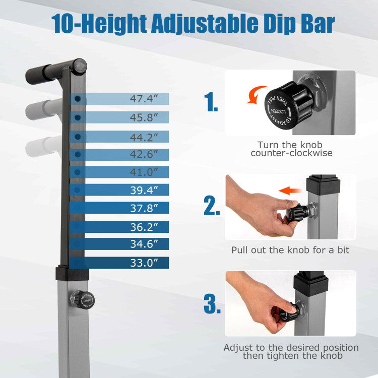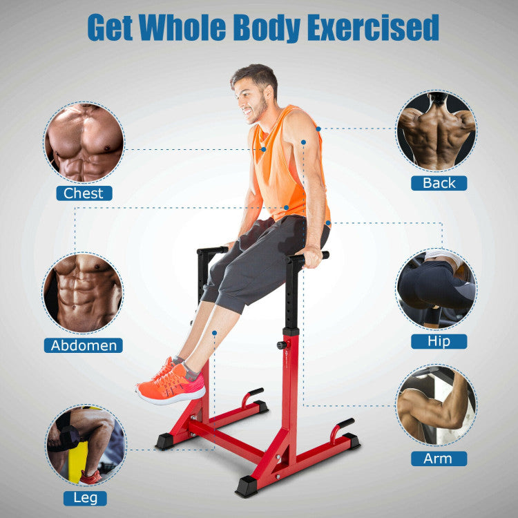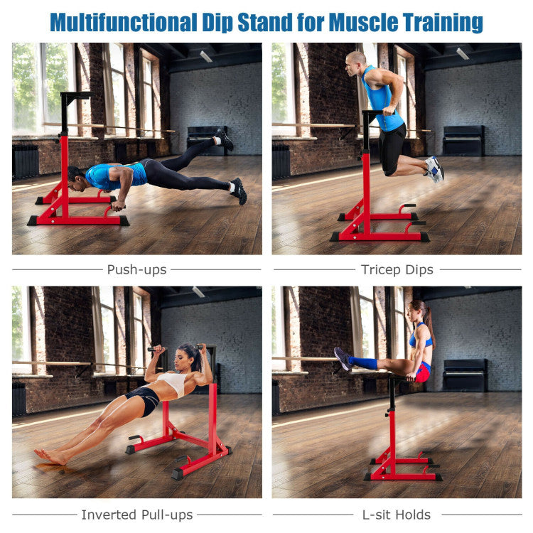 What's more, the handles and bars are reinforced by triangular structures for extra sturdiness. And the wide base is equipped with non-slip foot pads, which can effectively enhance the friction to prevent slipping. Besides, we also care about your comfort in the way that we wrap the handles with soft foam. More importantly, the dip bars are adjustable in height, which means you can customize an ideal position for tricep dips, inverted pull-ups and L-sit holds. And the dip station is relatively compact and lightweight to move around, making it an ideal choice for home gym.