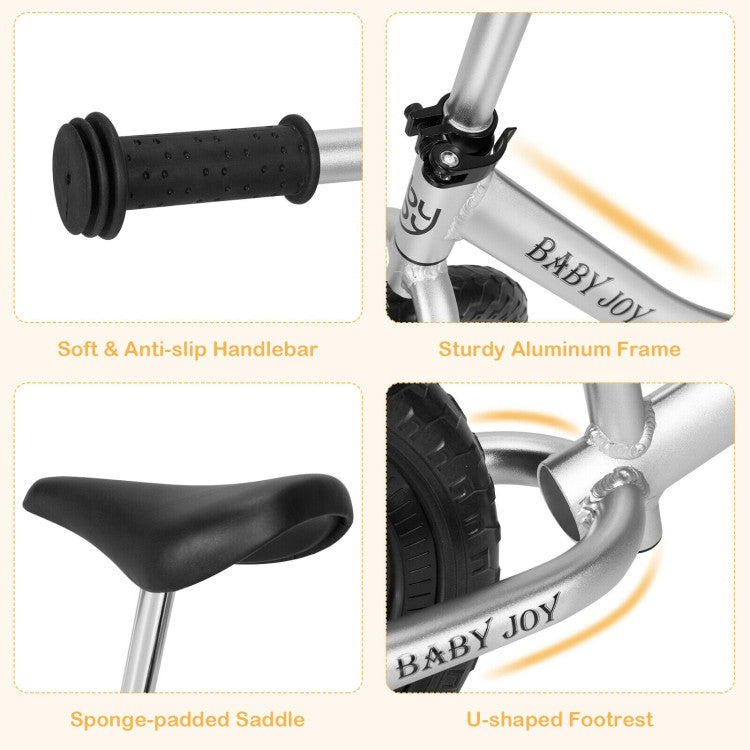 This kids balance bike is entirely constructed with high quality aluminum frame, which ensures durability for long-lasting use and accompany your kids in their growing up. Featuring an adjustable handlebar and seat, the bike is perfect for kids over 2 years old to find the most suitable position to ride. The sponge-padded saddle will keep your kids comfortable after a long time riding. Enjoy the adventure on different roads as the wear-resistant wheels can work well with all terrains. Don’t hesitate to take this perfect gift home for your little ones and bring them a happy childhood!