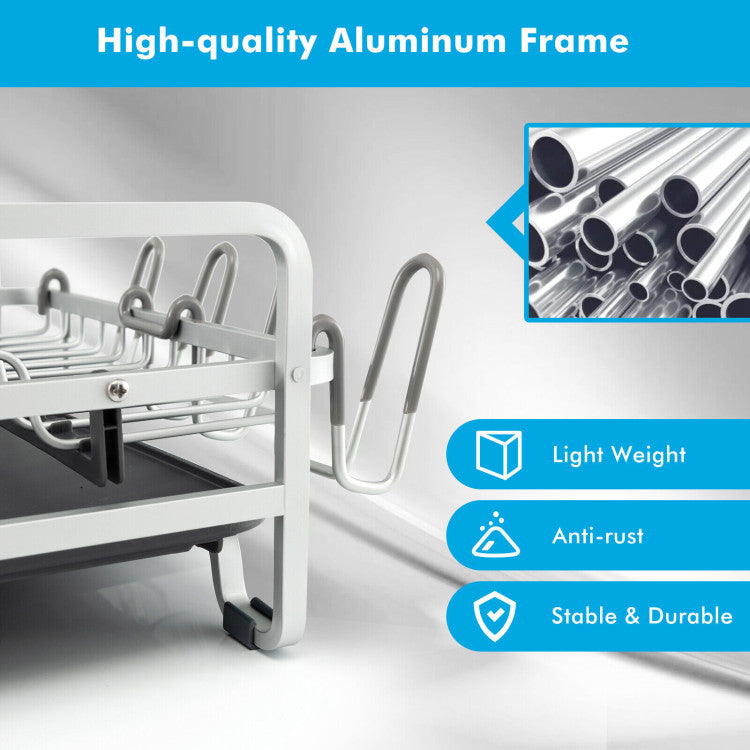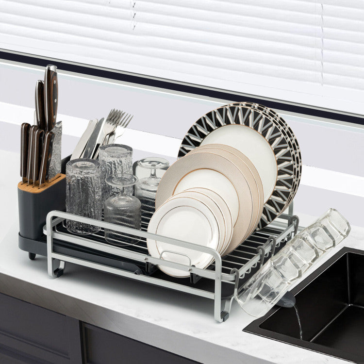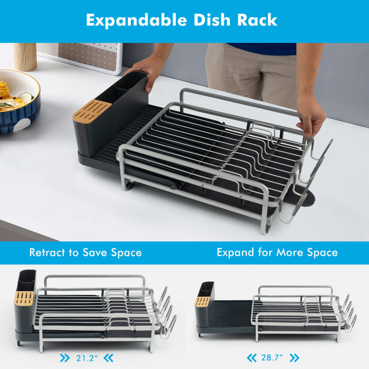 This kitchen dish drainer has plenty of space to hold your cutlery, plates, bowls, glasses, kitchen knives or other utensils. The water on the utensils will drop into the drainboard and directly drain out through the spout without wetting the counter. Besides, the drain spout can be easily turned 360 degrees to fit the distribution of sink. If you don't have a lot of utensils, the dish drying rack allows you to retract it to save counter space. You can also disassemble all parts to clean them if you need to. And made of high-quality aluminum, this kitchen dish drying rack is more durable than others.