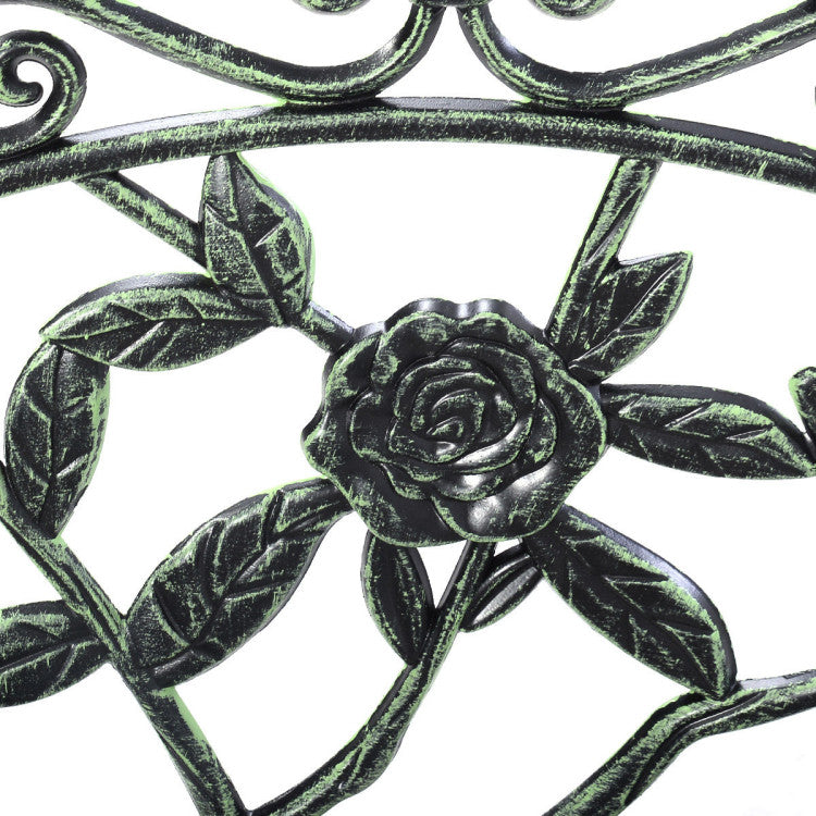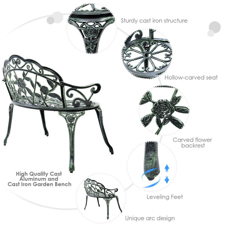 The bench features an antique rose style, which is not only an antique piece of garden furniture, but also a newly craft. Made of cast aluminum, the bench is sturdy and durable.