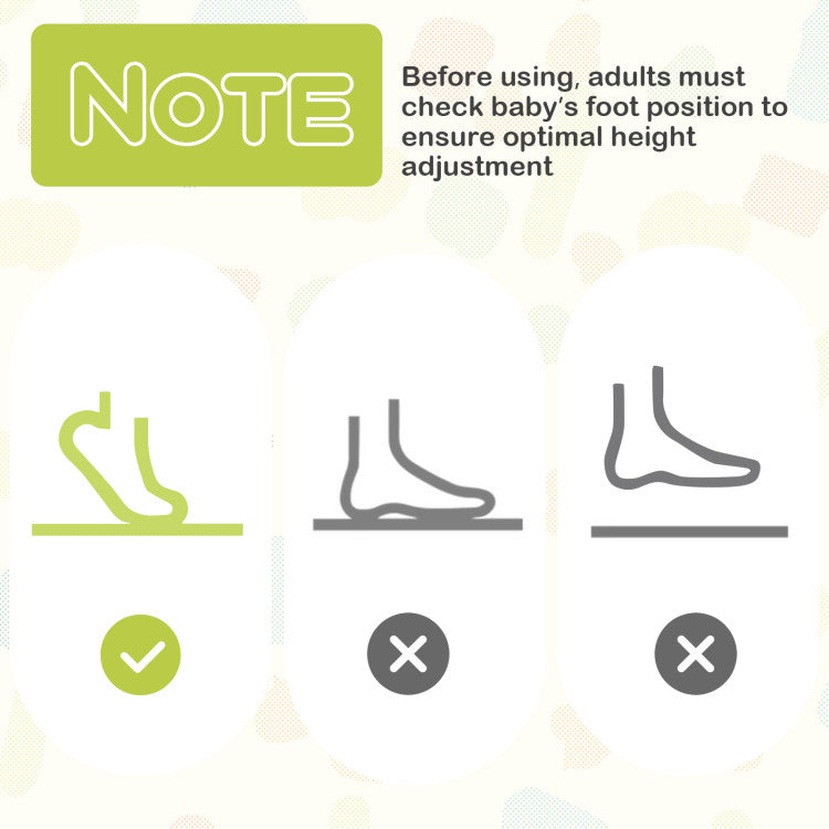 -Note: before using, adults must check baby’s foot position to ensure optimal height adjustment.