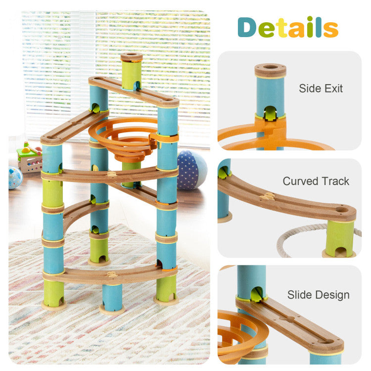This 106 pcs bamboo marble run set is an ideal choice for kids to explore, play and create.