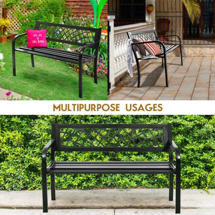 Stable and Long-Lasting Metal Bench Frame: This outdoor bench is mainly crafted of high-quality and durable steel which is sturdy enough and handled with exquisite finish coating to maintain rust and weather resistant. Two front legs integrated with two armrests and rear legs combining with the backrest form a solid construction. Exquisite and Stylish Design: Backrest of this garden bench presents a metal mesh shape which looks stylish and chic and matches any style of your garden or patio. In addition to its functional role, the bench can also work as a modern ornament in your backyard. Featuring ergonomic design, this bench backrest makes you feel relaxed and comfortable while leaning on it. Easy Assembly: Assembly instruction and high-quality hardware greatly assist you in assembling the bench well in short time. Specific installing steps are shown on it for your reference. If having any problem during assembling, you can feel free to inquire customer service. Easy to Keep Clean: With immerse painting and sleek surface, it is easy for you to clean the garden bench. Metal slats seat is perfectly suitable for outdoor use because gap between slats is good for draining on rainy day. Powerful Weight Capacity: The max load-bearing capacity of this patio seat is 500 lbs which can hold about 4-5 persons. It will gives you a warm safety protection.