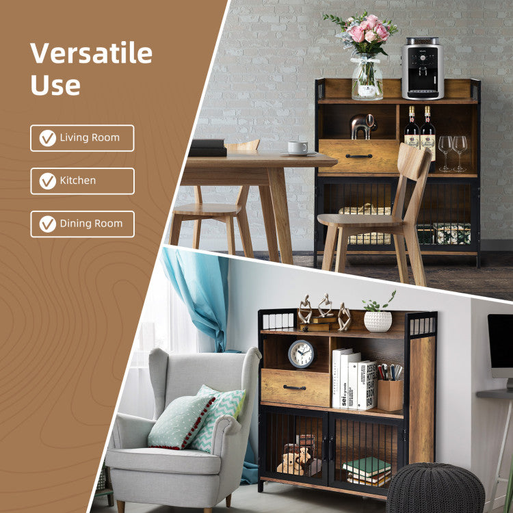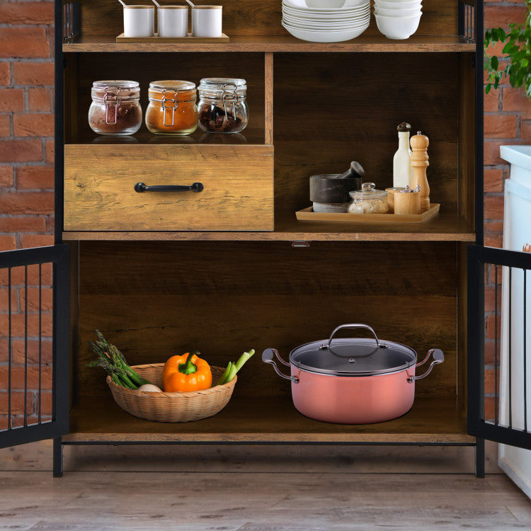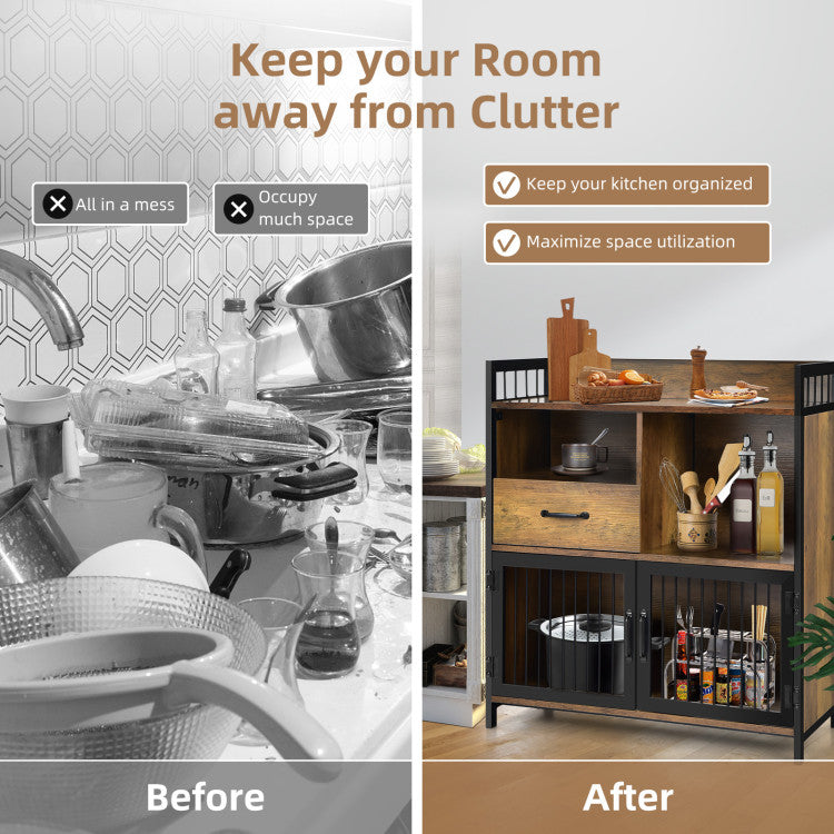 Coming with diverse storage areas, the sideboard can accommodate plenty of items and withstand a great weight up to 14 5 lbs. The countertop fitted with an anti-fall edge is suitable for food preparation. Small open shelf and deep drawer can store diverse tableware. The big shelf can accommodate a mini oven. Designed with see-through steel doors, the closed compartments offer you a clear view inside. Meanwhile, the 31.5" x 14" x 36" cupboard also features non-slip foot pads for good stability and floor protection. Being placed in different places, it will play different functions.