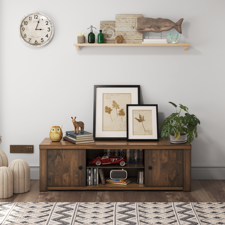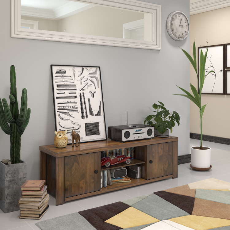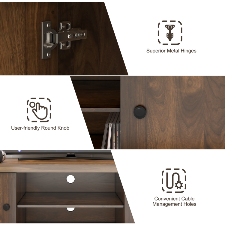 Do you want to enjoy your favorite TV show intently without being disturbed by messy surroundings? If so, the TV stand striking the perfect balance between elegant design and ample storage shall be a good choice for you. Wide countertop allows it to accommodate up to 65-inch TV. Stop seeing a tangled mess of wires thanks to the 2 pre-drilled cable management holes at the back. Make full use of open shelf at the center and 2 cabinets at the sides to store necessities. Enclosed cabinets offer more resistance to dust while the open shelf allows you to display beautiful ornaments. No need to worry about the cleaning homework since the smooth surface makes it easier to wipe dust off. Furthermore, if you like, it is capable of being used as a storage cabinet rather than TV stand.