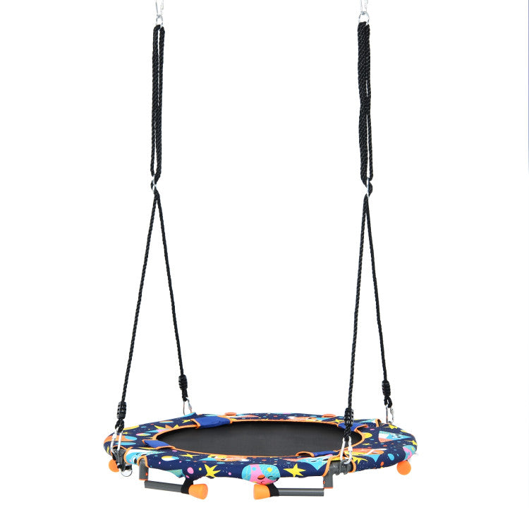 The convertible trampoline and spring set with high novelty will satisfy multiple playing demands of your little one. When used as a trampoline, our product has multiple benefits to kids, such as enhancing bone growth and strengthening kid's balance ability, and gives considerate protection with sturdy steel structure and foam-covered handrail. When the kid feels tired, you can transform the trampoline into the swing, making your little one swing on it with relaxation. Our product is suitable for both indoor and outdoor use and you can carry or store it without efforts thanks to its foldable design.