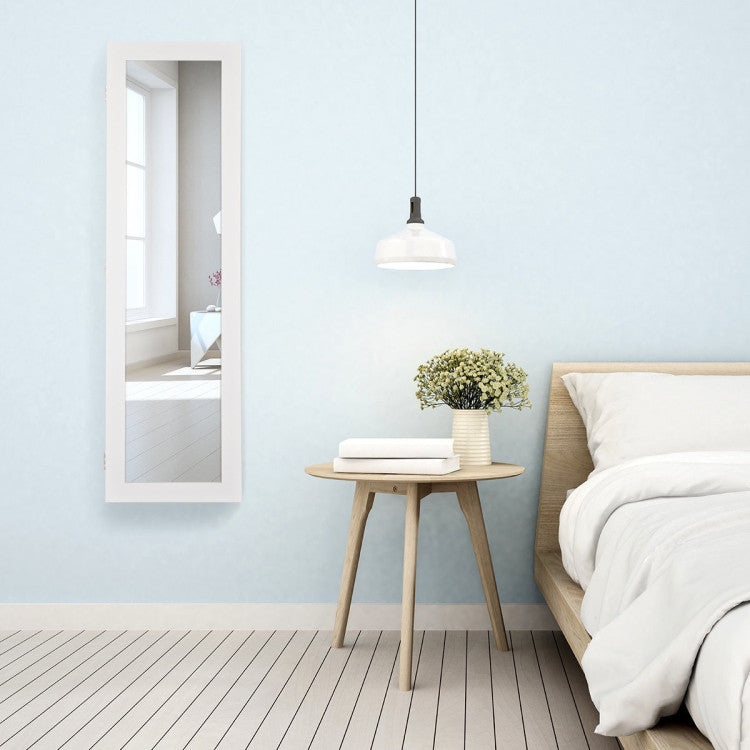 Wall or Door Mounted: This jewelry cabinet can be mounted on the wall with screws or hung over the door with its included hooks. The hooks are compatible with various doors and do not diminish the functions of the door. It features a full length mirrored door which can be opened to provide you with a large and well laid out space for your jewelry collection. Amazing Storage Capacity: 2 lined shelves designed for holding earrings, 16 hooks for necklace and bracelet, 6 rows of ring slots (60 ring slots), 5 storage shelves. This roomy armoire easily gets all your jewelry neatly organized and keeps it in good condition. Additional Protection: The protective black fabric lining prevents your valuable jewelry from being scuffed and scratched, bringing you a spectacular tactile and visual experience. Its lockable casing also provides extra security for the things most precious to you. The Perfect Blend of Style and Practicality: Made from strong MDF, this elegant cabinet is durable. In general, the exterior white finish will complement most interior styles of a home. Easy to Assemble and Easy to Clean: We offer an in-depth and easy to understand instruction booklet, helping you set up the cabinet quickly. All hardware included. With a wipe clean surface it is also easy to clean.
