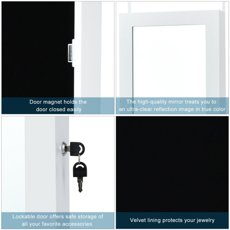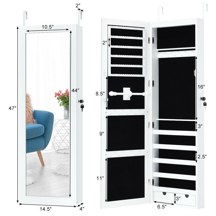 -6 lined shelves for holding earrings, 5 rows of ring slots (60 ring slots), 29 hooks, 5 storage racks, 2 storage drawers, 1 scarf rod