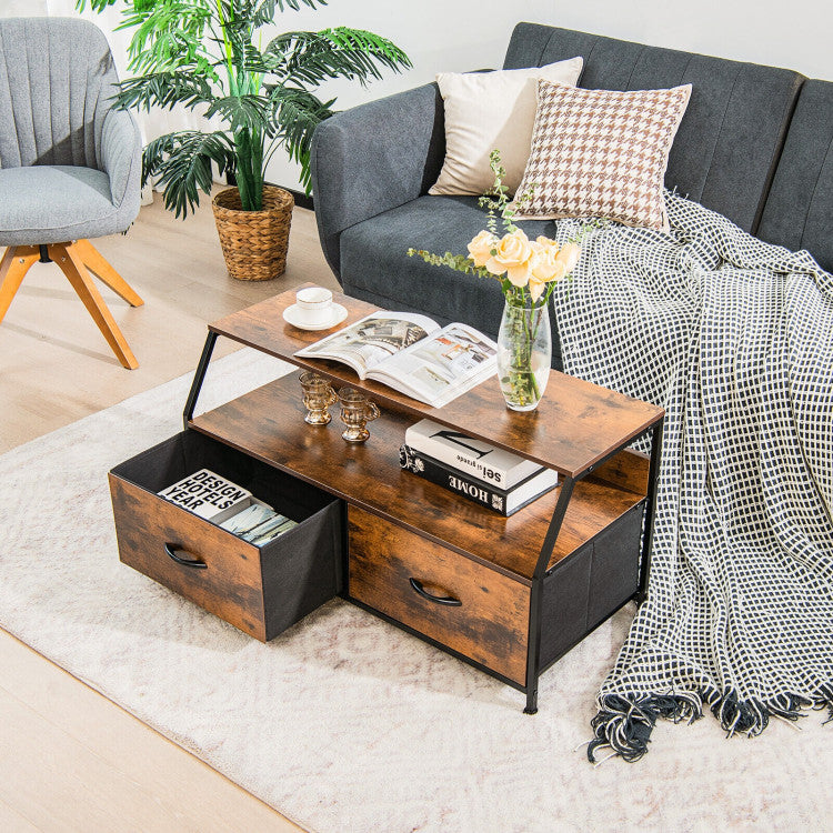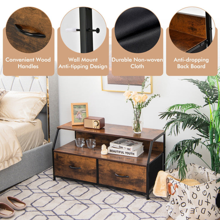 The dresser consists of 2 open shelves and 2 pull-out fabric drawers, offering ample storage space for books, clothes, CDs, ornaments and more.