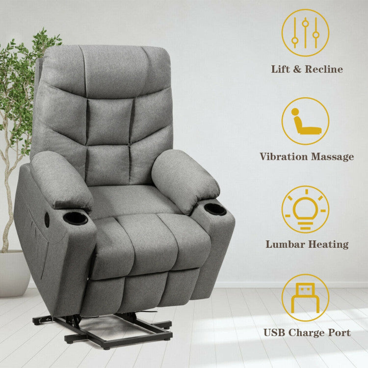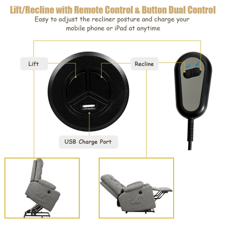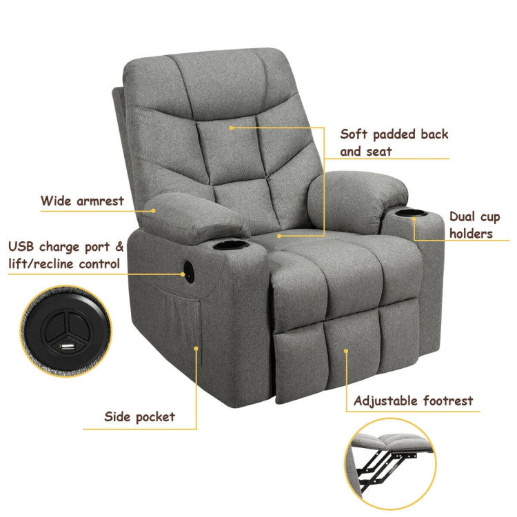 Multiple massage functions for 4 body zones and lumbar heating function will eliminate the fatigue of daily life. With electric powered lift mechanism, the senior is able to stand up or lie down with ease. Besides, wide armrest, extending footrest, overstuffed back and thick cushion are combined together to offer incredible comfort. Also, this electric reclining chair is equipped with 2 cup holders, 2 side pockets and a USB charging port for your convenience. Relax on comfortable seating that's made just for you.