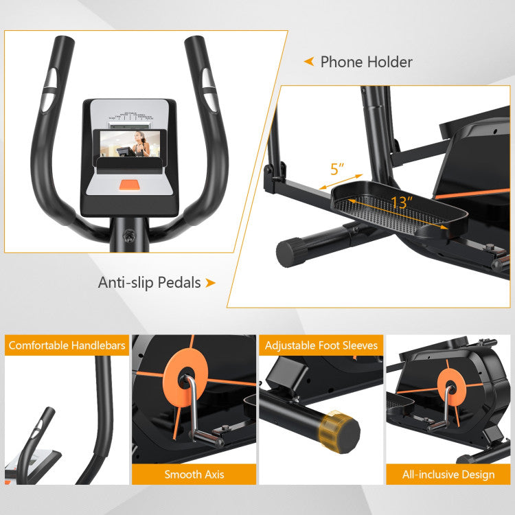Bothered having no time to go to the gym for a workout? Our elliptical training machine is an excellent machine to achieve the best physical condition and even help you with rehabilitation since it will not have any impact on your joints. With an LCD monitor, it will track and scan your sports data, such as speed, time, pulse rate, and so on. This helps you to make a more reasonable and effective workout plan. The smooth and quiet magnetic flywheel is designed for a better user experience. Equipped with 8-level magnetic resistance control, exercisers of all stages can get efficient exercise according to their needs. Plus, it has two transportation wheels in the front, so it's very easy to move the machine to another place. Come and get this cross trainer and you can exercise at home!