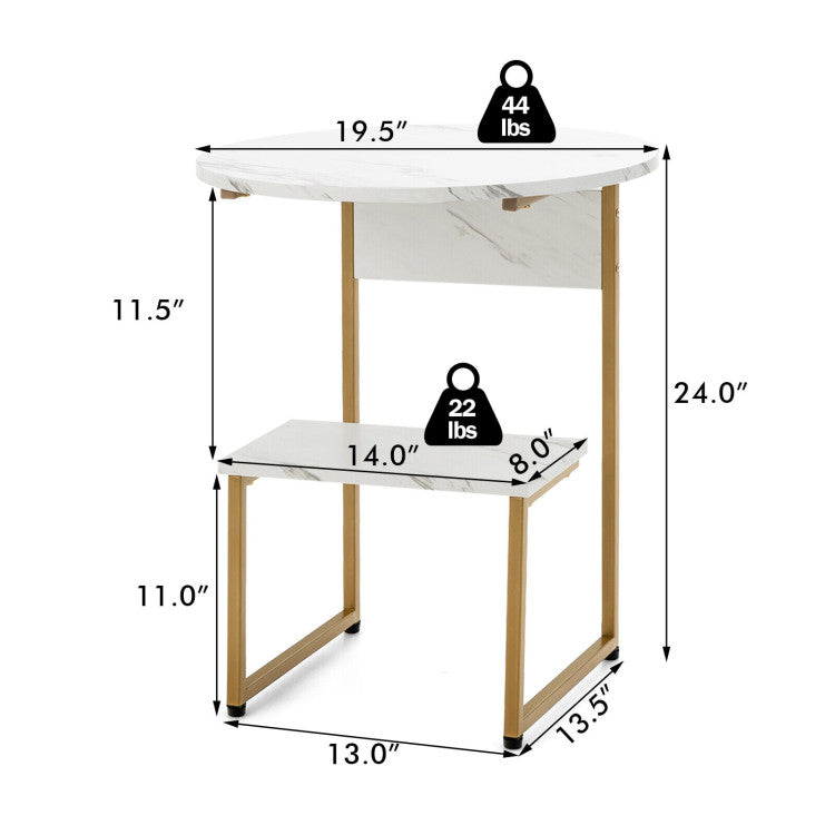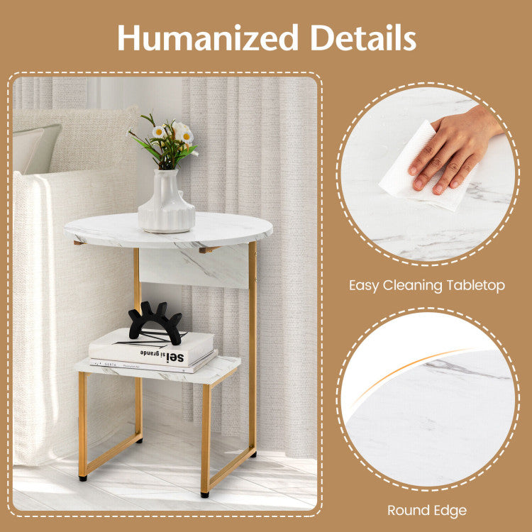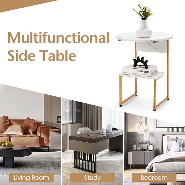 Being small in size, the end table is still functional and useful because the 2-tier design provides ample space for storage and display. Thus, the table can serve as a coffee table, a nightstand or couch side table to bring convenience when you are enjoying your leisure time on the sofa or bed. What's more, the modern end table is sturdy and durable thanks to the stove varnishing G-shaped steel frame. And the adjustable foot pads can keep the accent table stable. In addition, the stylish appearance with faux marble and gold frame makes the end table match different furnishing styles.